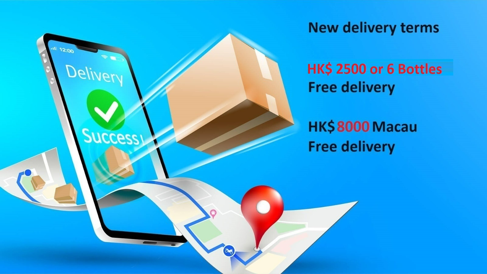 We provide free delivery service for purchase each order of above 6 bottles or HK$2500 (If not, please refer to the schedule)
